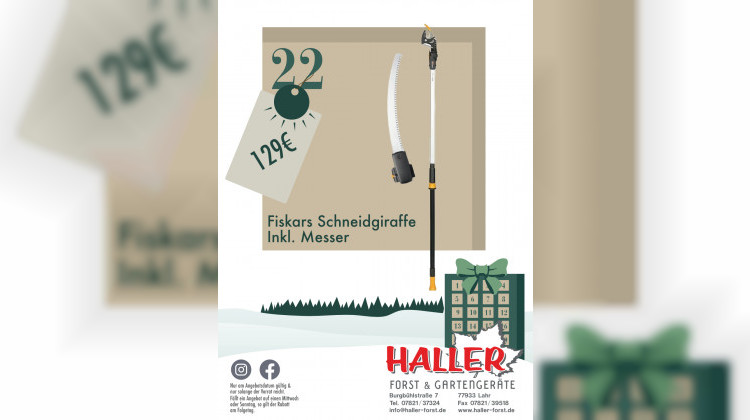 Die Schneidgiraffe erreicht hohe Äste ohne Leiter. Präziser Schnitt und stabiles Messer inklusive. Heute für 129 Euro bei Haller Forst und Gartengeräte. Solange verfügbar.